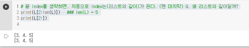 # 끝 index를 생략하면, 자동으로 index는(리스트의 길이)가 된다. (맨 마지막) Q. 왜 리스트의 길이일까?